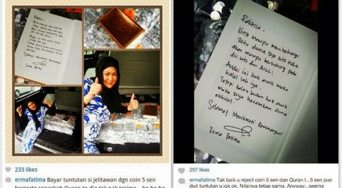 Makin Panas !! Erma Fatima Perli Rebecca " Tak Baik You Reject Con 5 Sen & Alquran" - Berikutan dengan isu Erma Fatimah membayar saman Rabecca Nur Al-Islam dengan coin 5 sen dan al-quran, baca SINI..