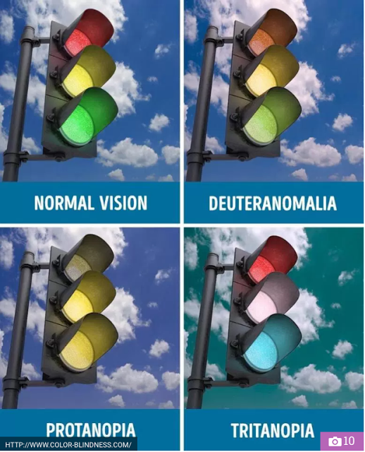 Buta warna ada 4 jenis, Normal, Deuteranomalia, Protanopia, Tritanopia dan Buta Sepenuhnya..Mungkin kalau korang tengok gambar ni, korang faham kot macam mana diorang tengok sesuatu benda tu :D Nasib baik orang-orang yang buta warna ni ada ujian khas untuk ujian buta warna jpj..Kalau tak... memang tak memandu lah kan.. Tapi terfikir juga kan, macam mana org buta warna drive? Macam mana diorang tengok trafic light? Macam ni gamaknya lah kot kan..