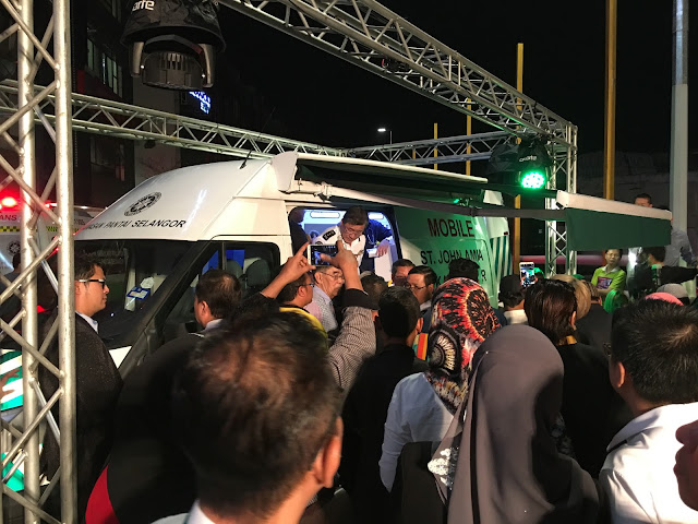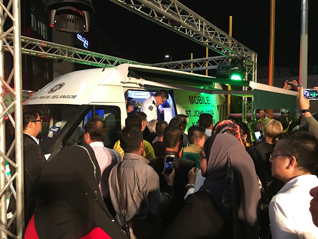 Ucapan-ucapan kata alu aluan di akhiri dengan majlis pelancaran Mobile Clinic Services yang dirasmikan oleh VVIP terhomat.. Tahniah diucapakan kepada Monspace dan Saint John Ambulans atas pelancaran ini..Selepas habisnya pelancaran ini, tetiba ada satu bunyiii kat belakang pentas. Haaa neves tak? Sebab bunyi ambulan yang sangat kuat berserta asappp yang tebal? Kau ghase acane tu? rasa macam ada kebakaran kan? Amboiii rupanya gimik je weiii.. Hahahaha walhal actually tu bunyi siren van baruuu MOBILE CLINIC tu lah... Berpusu-pusu orang kat pentas terus menuju ke belakang pentas menyerbu mobile clinic tu.. Sampai bertolak tolak kami ni haaa.. Btw, Siapa nak tengok Mobile Clinic tu? Angkat tangan !! *gitueww*