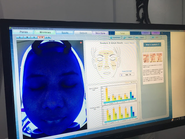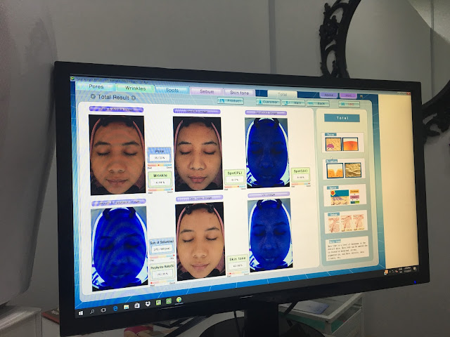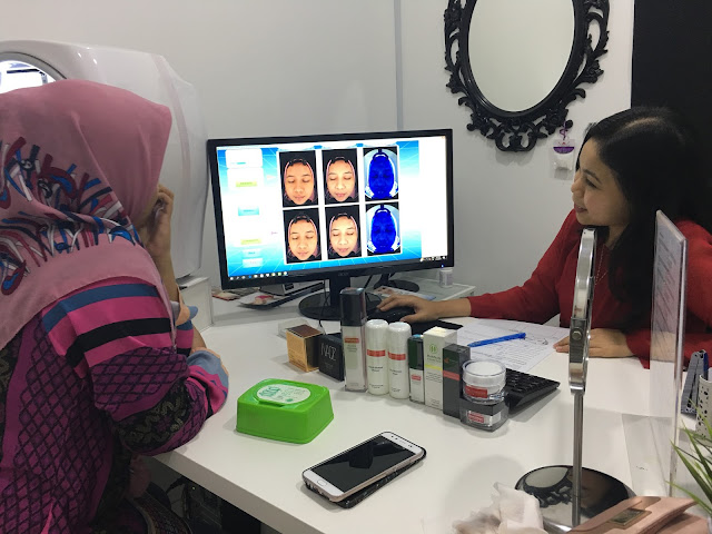 Memula beauty consultant remove mekap uzu dulu.. Wuuuu uzu baru pakai mekap sejam yang lalu, hahaha dah kena remove mekap pulak dah.. Tapi demi mendapat skin analisis sebenar, maka dengan rela hati remove mekap.. Lepas tu baru skin analysis guna mesin khas. Canggih betul kan teknologi sekarang? Boleh check pori-pori, kedutan, bintik bintik, sebum , dan warna tona kita, sekata ka tak.