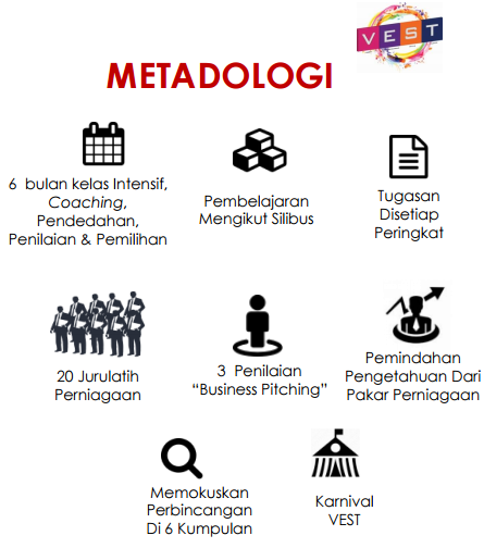 Program ini mengambil masa lebih 6 bulan.. So dalam tempoh 6 bulan ni, macam-macam aktivti yang dijalankan sebelum pertandingan dimulakan.. Pertandingan ini akan adakan 6 bulan kelas intensif, coaching, pendedahan dan penilaian.. Kemudian , ada pembelajaran mengikut silibus, ada tugasan disetiap peringkat, lebih dari 20 jurulatih pernigaan yang akan membantu para mahasiswa, 3 penilaian business pitching, pemindahan pengetahuan dari pakar perniagaan, memfokuskan perbincangan 6 kumpulan dan tak lupa juga ada karnival VEST di penghujung pertandingan..