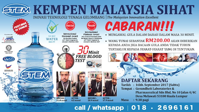 So sesiapa yang nak join kempen malaysia sihat, pihak STEM akan adakan kempen ni pada 16 September 2017 di esundheit Laboratories Pharmaceutical Sdn Bhd. Alamat dah ada kat banner. Siapa yang nak datang , akan dapat Free Blood Test , free dapat minum air stem dan free juga dapat turunkan bacaan darah u ols. Semua jenis penyakit boleh..