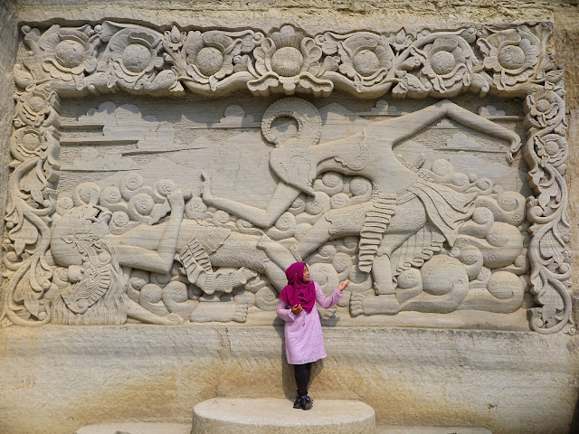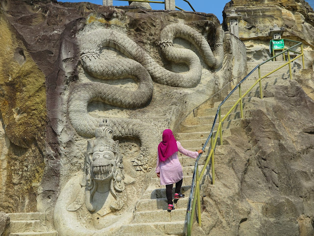 Ada ukiran naga kat dinding tebing ni. Boleh naik atas guna tangga tu..