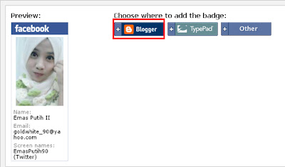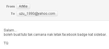 Baru dapat email dari Armie. Nak request tutorial buat facebook badge. Dengan segera uzu buat. hehe