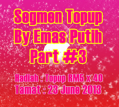 $ 0 0 As-SalamSegmen Topup by Emas Putih Part #3Klik banner di atas kalau nak join.Ada 40 x Topup RM5 untuk dimenangi !!Tarikh tamat : 23 Jun 2013